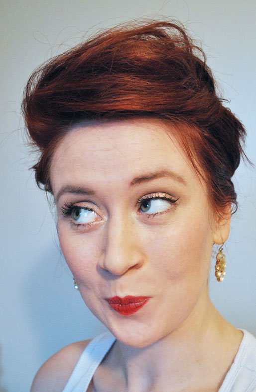 I brushed on a very light shadow all over my lid, then used my Hard Candy Eye Def Metallic Shadow and swept it across my top lash line. There are many options to use-eye shadow works really well especially if you wet it first. A metallic, bronze, or blush pink are great but also use your eye color as a guide when choosing which color for best eye optimization [I just made that term up on the spot. Is it weird?].